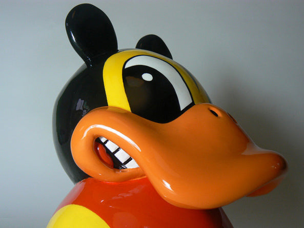 Micky Duck sculpture. Designed by HuskMitNavn and produced by toykyo.be 24x19x15 cm. Handmade in Belgium. Hand painted porcelain. Edition of 12. For sale at Charlotte Fogh Contemporay in Århus and V1 Gallery in Copenhagen